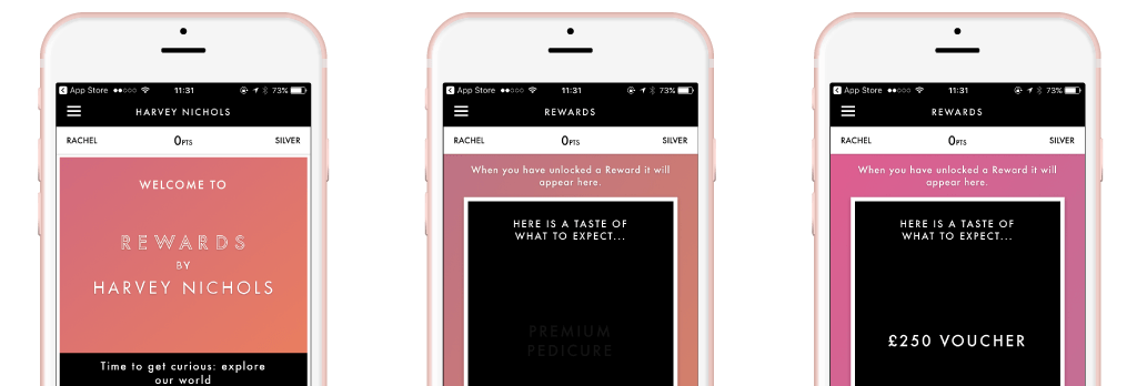 An example of a great mobile loyalty scheme is the Harvey Nichols Rewards app. Users can access a loyalty programme exclusively in-app, receiving points and perks based on their in-store and online shopping habits. Loyalty scheme members receive vouchers to spend in-store as an incentive to return to the store, which helps drive footfall.